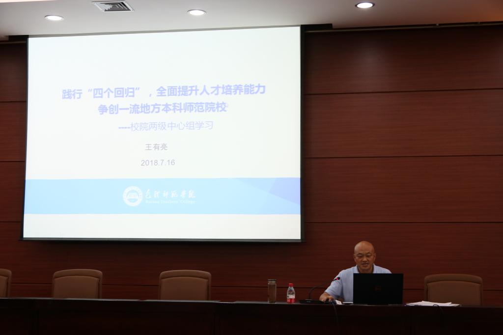 7月16日、17日,我校在图书馆会议厅组织2018年第十至十三次校院两级中心组集体学习,深入学习了2018年新宪法、全国高等学校本科教育工作会议精神,组织观看了《深入学习领会〈习近平新时代中国特色社会主义思想三十讲〉》视频讲座,并安排部分处级干部代表就学习党的十九大精神和习近平新时代中国特色社会主义思想的情况进行了交流发言,组织全体处级干部进行了理论学习测试。校领导、副处级以上干部参加了学习会。