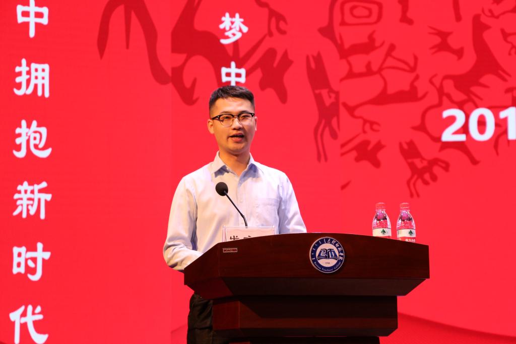 美术学院2018届毕业生徐一阳代表全体毕业生发言,深情回忆了大学四年的成长与收获,表达了对母校、老师、同学的感恩祝福之情和面向未来努力实现梦想的高远志向。