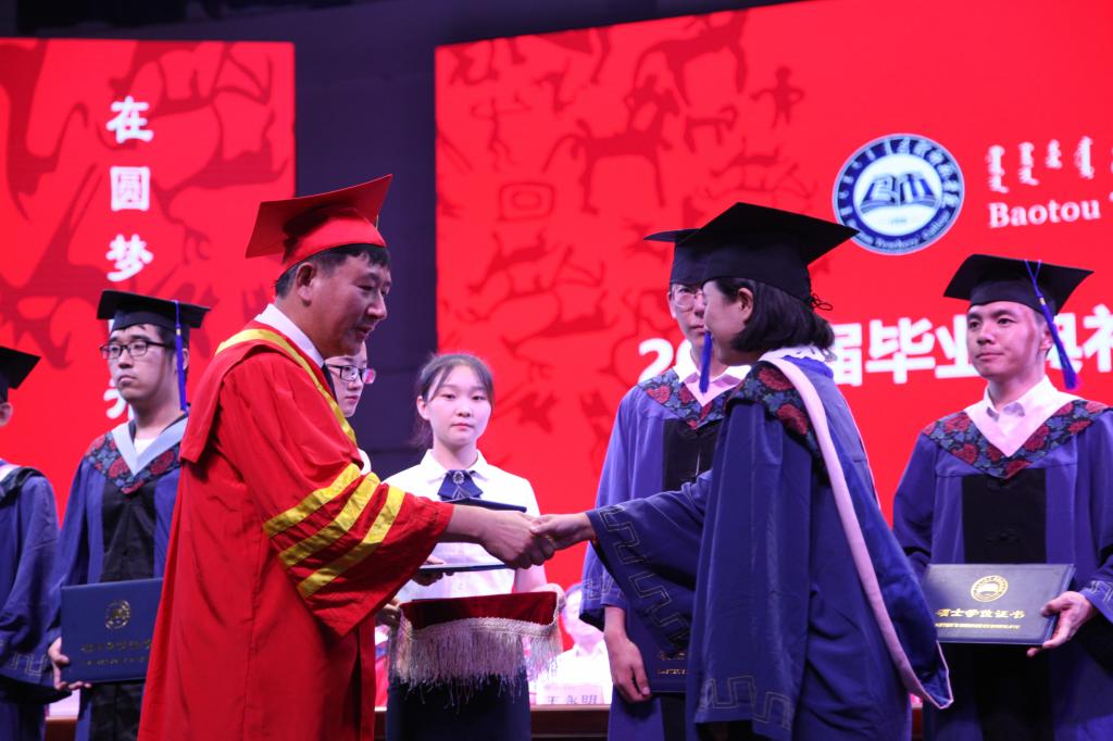 我校85届毕业生、包头市高新一中副校长刘淑琴代表校友为即将走出校园的学弟学妹送上美好祝愿,为毕业生们讲述了她毕业后从事基础教育事业33年的奋斗历程。她鼓励大家要看天、看地、看远方,立足平凡,不忘初心,砥砺前行。