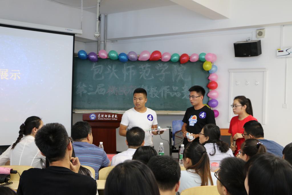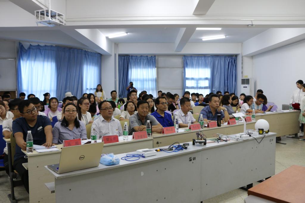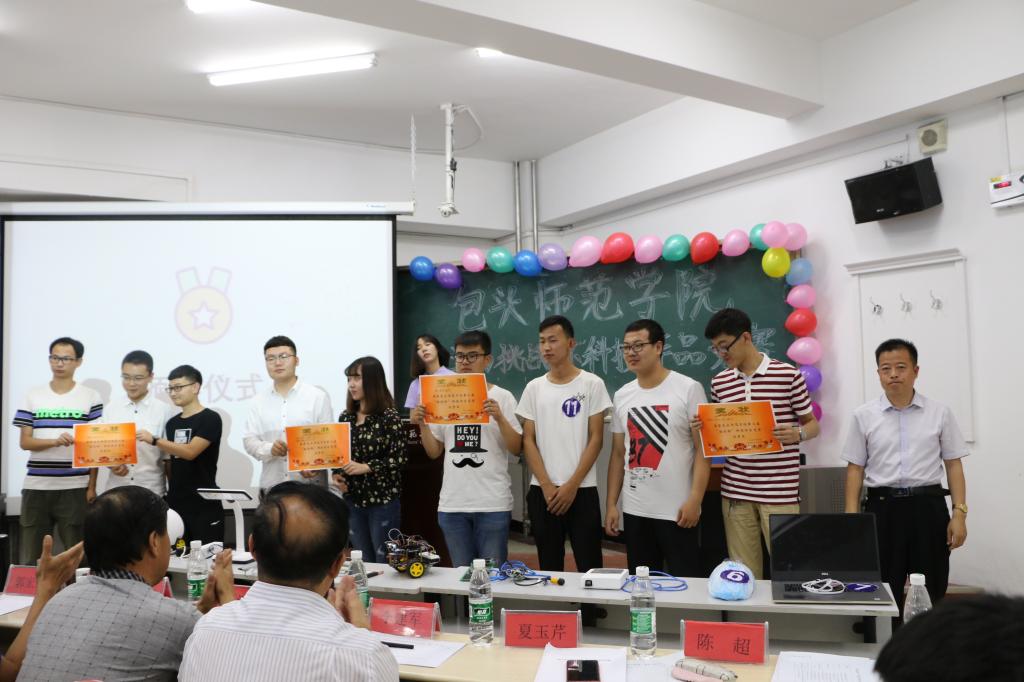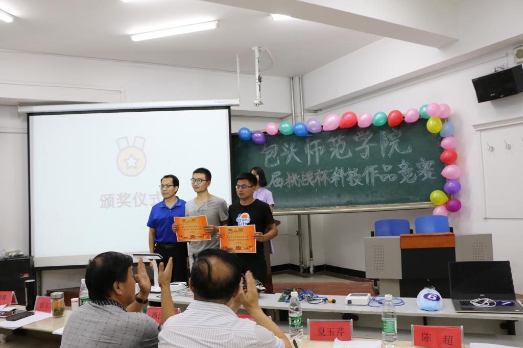 为了贯彻落实党的十九大精神,庆祝我校建校60周年,激发学生的专业学习兴趣,磨炼学生刻苦钻研的意志,提高学生的自主创新和实践能力, 6月21日下午,由校团委主办、信息科学与技术学院承办的一院一品暨包头师院第三届“挑战杯”科技作品竞赛在博学楼博西104教室举行。信息学院党总支书记周汉忠、院长马占飞、资环学院党总支书记李建军出席活动。信息学院党总支副书记副院长郭宏升、电子系主任巩瑞春、计算机系主任夏玉芹、陈超老师、辅导员徐丹担任本次竞赛的评委。电子和物联网专业1-3年级的学生代表观看了比赛,来自信息学院的10支队伍和资环学院1支队伍参加了比赛。