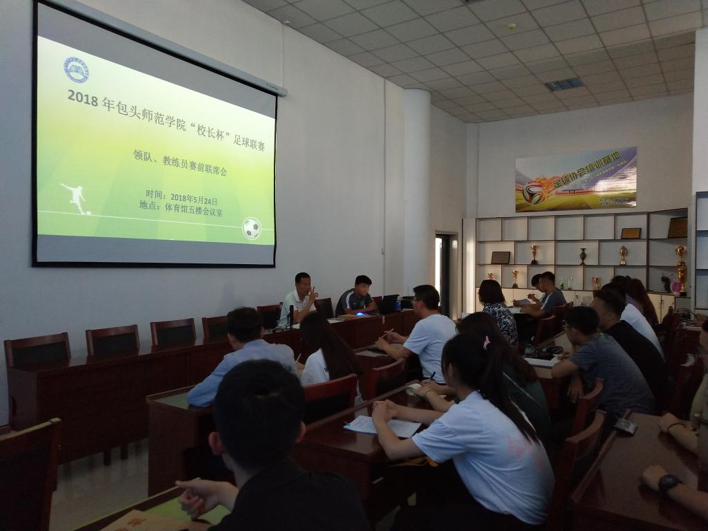 2018年包头师范学院“校长杯”足球比赛领队、教练员赛前联席会于2018年5月24日在体育馆五楼会议室正式召开。裁判长为各领队、教练员讲解比赛流程及注意事项,之后进行抽签分组仪式。