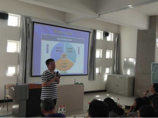 首先,高老师分享了教育实践中的成果与经验,罗列了大多新教师所面临的问题与困惑,指出许多新老师在工作上虽然尽心尽力,但是却事倍功半,其中的主要原因就是对职业生涯的认识存在盲目,茫然以及盲点,解决问题的关键在于学在课堂、教在课堂、练在课堂、高效在课堂。其次,对于职业与职场的关系的问题,高老师发表自己独到的观点:如果把职业人比作劳动力商品的话,那么其中的因素有,知识储备,从学历、投资、人品,同时提醒同学们在职场要多方面学习并且让自己“升值”;最后,高老师从备课、备教材、备学生等方面介绍了教学常规应做的准备,同时也做了总结:一是用专业赢得自己的尊严,解决其他人解决不了的问题;二是把工作当学问做,不断探索;三是成长就是做最好的自己,深入发掘自己的潜能,提前做好各项准备工作。