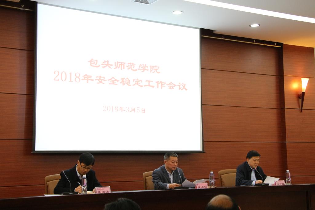 3月5日,我校在图书馆会议厅召开2018年校园安全稳定工作会议。校党委书记王永明出席并讲话,校党委委员、副院长、综治委主任施纪华主持会议,各二级学院党总支书记、院长、各部门负责人、保卫处科以上干部、包头市公安局派驻我校警务室警长参加了会议。