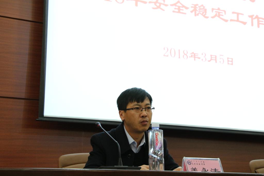 王永明同志在讲话中强调,2018年是国家、自治区和我校改革发展的重要机遇期,大事多、任务重、要求高,没有安全稳定的环境就谈不上发展,做好2018年学校的安全稳定工作尤为重要,全校各级领导干部、全体生生员工要高度重视,切实压实校园安全稳定工作责任,传到工作压力,创造安全的校园环境。