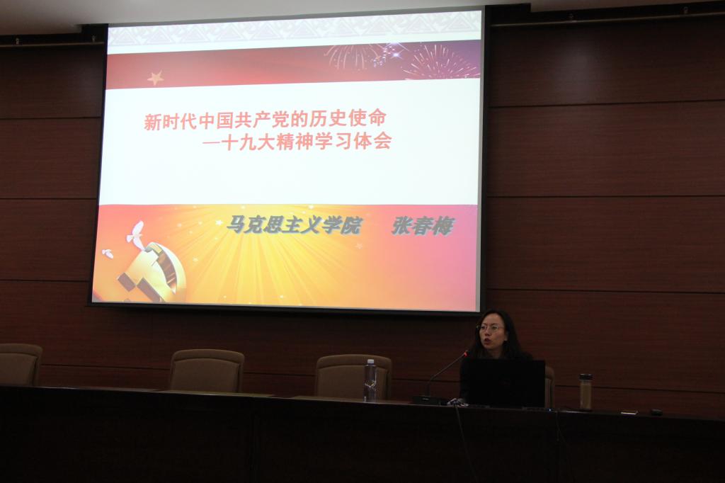 我校理论讲师团成员(自治区、包头市十九大精神宣讲团成员)马克思主义学院张春梅教授、李德英副教授分别以“新时代中国共产党的历史使命”、“新时代 走进世界舞台中央”为题,围绕“新时代”这个主题进行了辅导讲座。