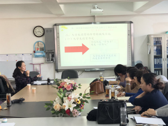 李艳芬教授毕业于内蒙古师范大学思想政治教育专业,呼和浩特职业学院马列部教研室主任、教授,自治区教学名师,自治区级教育创新行动计划项目负责人。兼任呼和浩特市哲学学会秘书长,内蒙古伦理学会秘书长,中国政治伦理学专业委员会委员。主要从事思想政治教育、政治伦理的研究,2016年获得内蒙古自治区哲学社会科学优秀研究成果政府奖三等奖,2017年获得内蒙古自治区哲学社会科学优秀研究成果政府奖二等奖。李艳芬教授主要就其获得自治区第六届哲学社会科学优秀成果政府奖二等奖成果《当代大学生德育实践与创新》进行介绍,分析成果的逻辑思路和其编著形成的实践理路,然后重点围绕编著的理论创新之一大学生德育导育的转换和实施展开宣讲。宣讲中指出:大学生德育是大学生在成长成才过程中需要的政治、思想、道德、法纪、人文科学和心理健康为主要内容情感教育与价值观教育。思想教育处于最高层次,对大学生的发展具有根本性作用;政治教育处于核心层次,对学生发展具有导向作用。而道德、法纪、人文科学、艺术、心理等教育处于基础层次,是大学生生存、发展的保证,所以大学生德育的目标不仅仅是“学为才”,而是“学为人”,为此,编著中提出当代大学生德育必须实现从“重教”向“重导育”转换,这种转换是克服“知识即美德”德知问题、实现大学生德育目标和大学教育必然性的应然性选择。