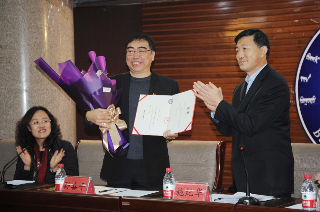张彩霞同志介绍了孙喜平先生简历和学术成就,施纪华副院长代表学校宣读了兼职教授聘任决定并为孙喜平先生颁发了聘任证书,对孙喜平先生加入我校教师队伍表示热烈欢迎。孙喜平先生对受聘学校兼职教授表态发言,他表示自己多年来教书育人的心愿得以实现,将切实履行授课职责,为同学们讲授《稀土化学》相关课程,为学校的专业建设贡献自己的力量。化学学院院长魏兵表示,此次兼职教授聘任充实了应用化学专业师资力量,加强了学术交流和学科建设,对促进校企之间的协同创新起到了有力推动作用。