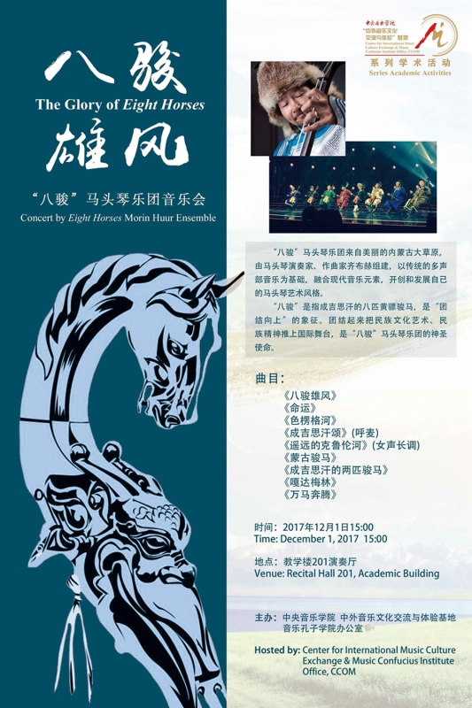 12月1日,我校音乐学院“八骏马头琴乐团”在团长齐·布赫老师的率领下,荣登“与世界分享中国音乐——第六届音乐孔子学院理事会年度会议暨跨文化音乐教学方法与策略国际论坛系列音乐艺术交流活动”现场---中央音乐学院的音乐厅。此次活动由孔子学院总部/国家汉办支持,中央音乐学院主办、中外音乐文化交流与体验基地及音乐孔子学院办公室承办。