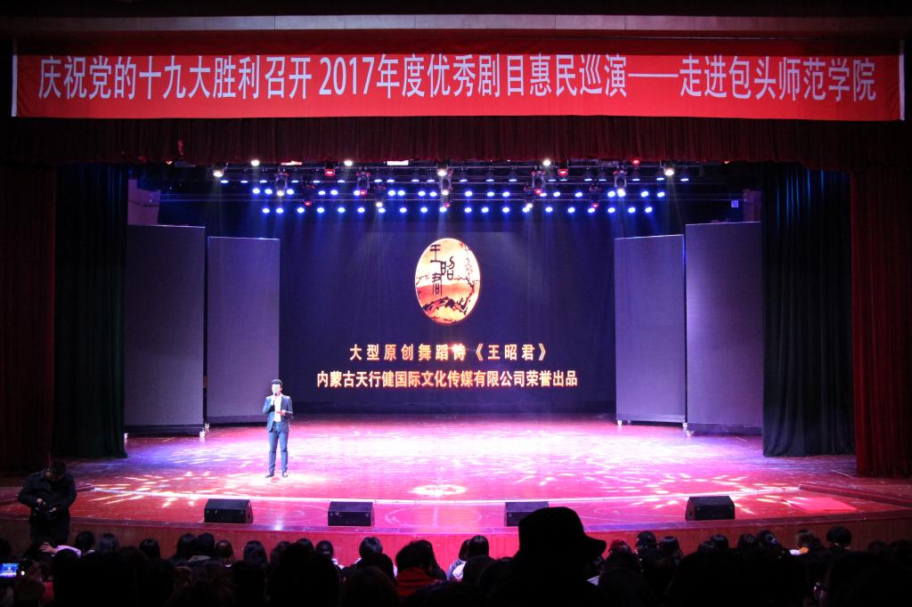 为庆祝党的十九大胜利召开,营造良好文化氛围,由内蒙古自治区党委宣传部主办,包头市委宣传部、呼和浩特市委宣传部承办的“庆祝党的十九大胜利召开2017年度优秀剧目惠民巡演”活动11月13日在包头师范学院会堂举行首场演出,包头师范学院教师、学生900余人观看了演出。