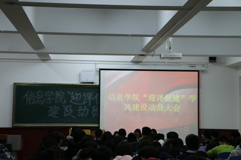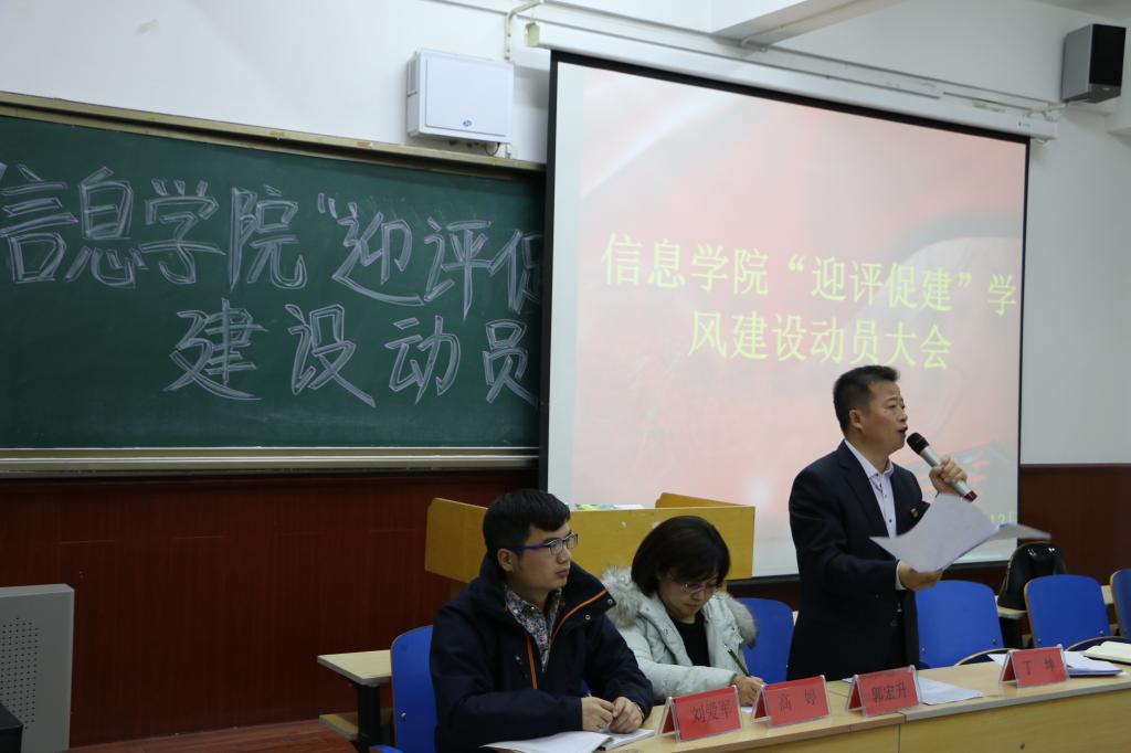 为迎接即将到来的本科教学审核评估,贯彻落实我校本科教学评估动员会精神,信息科学与技术学院在对全体教师和部分学生干部动员的基础上,11月13日晚,在博学楼500教室召开了“迎评促建,加强学风建设”动员大会。信息学院副书记副院长郭宏升、学工办主任丁坤、辅导员刘爱军、姜嘉丽、王凝、高婷和全体学生会干部,各班级班委会团支部成员,宿舍长,预备党员,入党积极分子参加了会议。