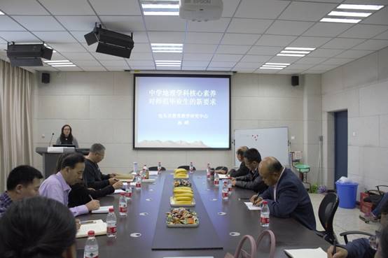 孙晔老师为在场教师讲述了中学生地理学科核心素养对师范毕业生的新要求。她结合了2017高中新课标,并通过具体课程内容更加详尽的让老师们理解了地理学科核心素养,接着又论述了学科素养与地理教学的关系,罗列了近年来地理学科的中考和高考题,分析了其中所渗透的学科素养。她提出了学科素养对师范毕业生的新要求,即在学习知识的同时加上实践经验,从而形成自己的地理学科素养。针对学校应如何培养学生的地理学科素养,她指出学校要增加教学实践的机会,运用灵活多样的教学方法,同时要搭配以恰当的评价方式。最后,孙晔老师与老师们分享了一些重要的地理科学期刊,希望这些期刊可以为各位老师的教学提供帮助。