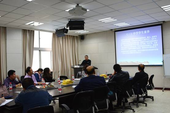 活动中,丁占良老师为在场教师阐释了中学生应具备的核心素养及地理学科的核心素养。他指出学生发展核心素养从多维度建构,不仅包含知识技能,而且包括能力、情感、态度、价值观等多个方面。地理学科的核心素养包含四个要素、三个维度,其中协调“人地关系”是地理课程核心价值观。接着,他又介绍了资源与环境学院地理科学专业的培养目标及建设思路。为让老师们能够更直观的了解这两方面的内容,丁占良老师结合地理科学专业的人才培养计划进行了讲解,并针对培养计划中不同性质的课程提出了其中存在的问题及相应的对策。他认为现存的课程知识过于分散,应对课程进行重新整合,同时增强学生的实践能力,加强大学与中、小学的对接。