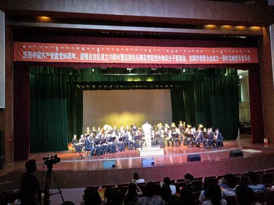 6月30日下午,庆祝中国共产党建党96周年、迎接内蒙古自治区成立70周年暨庆祝包头师范学院党外知识分子联谊会、归国华侨联合会成立一周年交响管乐音乐会在包头师范学院会堂隆重举行。包头市归国华侨联合会副主席贾建平,中共包头市委统战部海外联络处处长王小敏、党外知识分子工作处副处长李拥军、宣传培训处副处长李馨、党派处副处长韩冬莉,包头市归国华侨联合会韩彩琴,校党委委员、组织部(统战部)部长郭金虎、副部长齐玲,校党委宣传部部长史瑜、教务处处长、校知联会和侨联主席王静及校知联会、侨联近百名成员、以及各学院700多名学生出席并观看了音乐会。