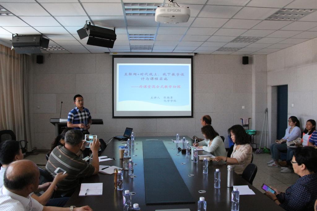6月7日下午,由教务处教师发展中心主办的互联网+时代线上、线下教学设计与课堂实施——雨课堂混合式教学初探教学沙龙活动在博东514举行。党委委员、副院长王有亮,教务处副处长周慧霞、任艳,各学院教学院长及系主任代表参加了本次教学沙龙活动。活动由化学学院院长魏兵主持。化学学院张骁勇博士担任本次活动的主讲人。