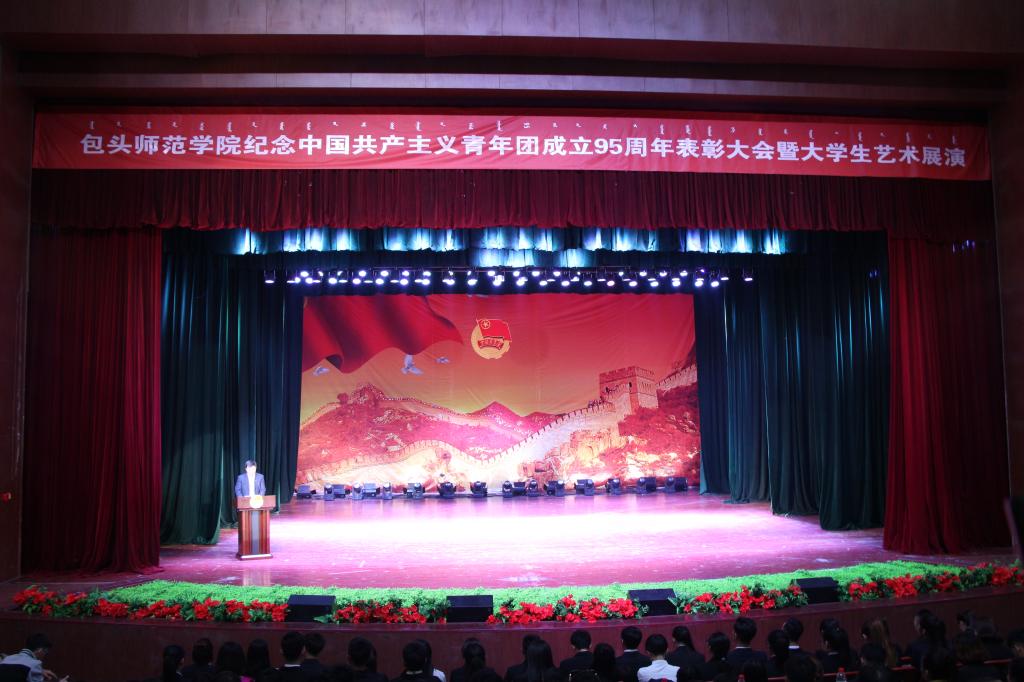 今年是“五四”运动98周年,也是中国共产主义青年团成立95周年。为了大力弘扬“爱国、进步、民主、科学”的五四精神,更好地表彰先进,树立典型,进一步激励全校各级共青团组织和广大团员、团干部在团的建设和各项工作中再创佳绩,展示我校艺术教育成果,5月4日晚,我校纪念中国共产主义青年团95周年表彰大会暨大学生艺术展演决赛在会堂举行。校领导王永明、刘兴旺、施纪华,学校各职能部门负责人,各学院党总支书记、分管学生工作副书记、副院长,团总支书记、辅导员以及部分学生代表参加了此次活动。国家一级演员乌仁奇其格、音乐学院党总支书记李红梅、音乐学院院长崔东伟、包头艺校副校长王英杰四位老师担任大学生艺术展演决赛评委。