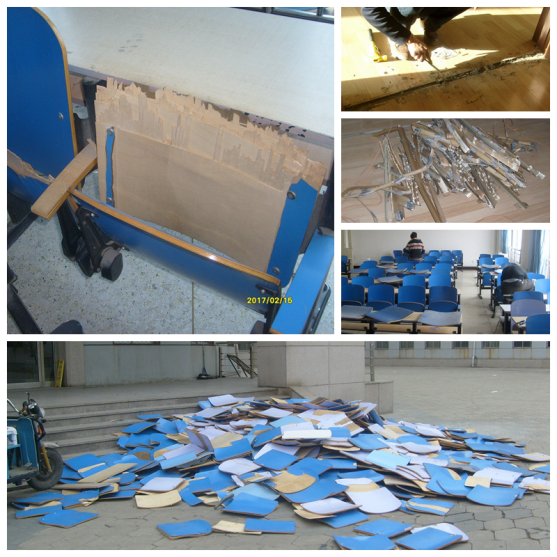我校博学楼、图书馆卫生间吊顶均有松动现象,部分已经脱落,具有一定安全隐患。寒假期间,我校物业服务管理中心共更换博学楼卫生间吊顶16套共计64间、更换图书馆卫生间吊顶14套共计42间。同时,修缮博学楼桌椅1500套,修缮图书馆隔断91套,更换图书馆木地板压条1200米。