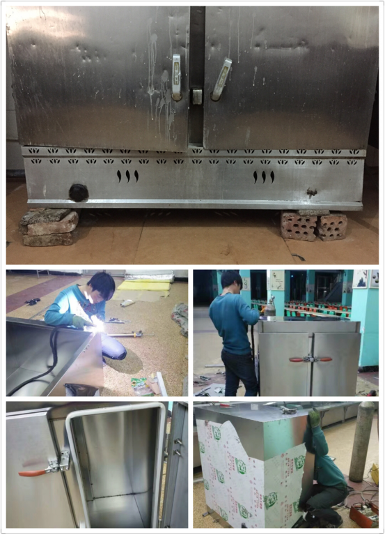 同时,还更换了南、北院老旧20层蒸汽蒸车和高功率电饼铛各5台、双头燃气灶1台。老旧蒸车因使用年限过长,密封性下降,个别箱腿腐蚀断掉勉强用砖头支撑,跑冒蒸汽有烫伤操作人员的危险,也会因蒸汽跑冒导致饭菜烹饪时间无法准确估算,严重影响饭菜质量和口味。电饼铛也因使用年限较长,导致加热不均匀,甚至原双面加热板仅有一面能正常工作,为食材的制作造成一定影响。