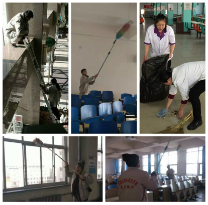 春天物业公司对学校博学楼、齐志楼、外语楼、物理楼、生化楼、行政楼、图书馆、美术楼、创业楼、音乐楼、旧逸夫楼、学生食堂、十七栋公寓进行了彻底的清扫。