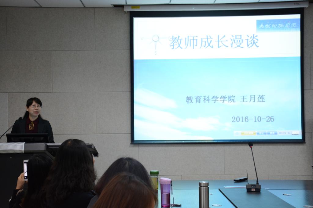 接着,有着12年教龄的王月莲老师从感悟、成长、困惑、展望四个方面讲述了她在教育科学学院多年的工作经历。她先用自己四个不同阶段的照片阐述了12年里自己的变化与成长。又从“学校平台为支撑”、“前人引领进步快”、“勤于反思行于惑”三方面总结了自己在专业上的成长。最后针对自己从教多年的困惑提出了展望,并表示“言爱无利育人魂”,要做一个有爱的教师。