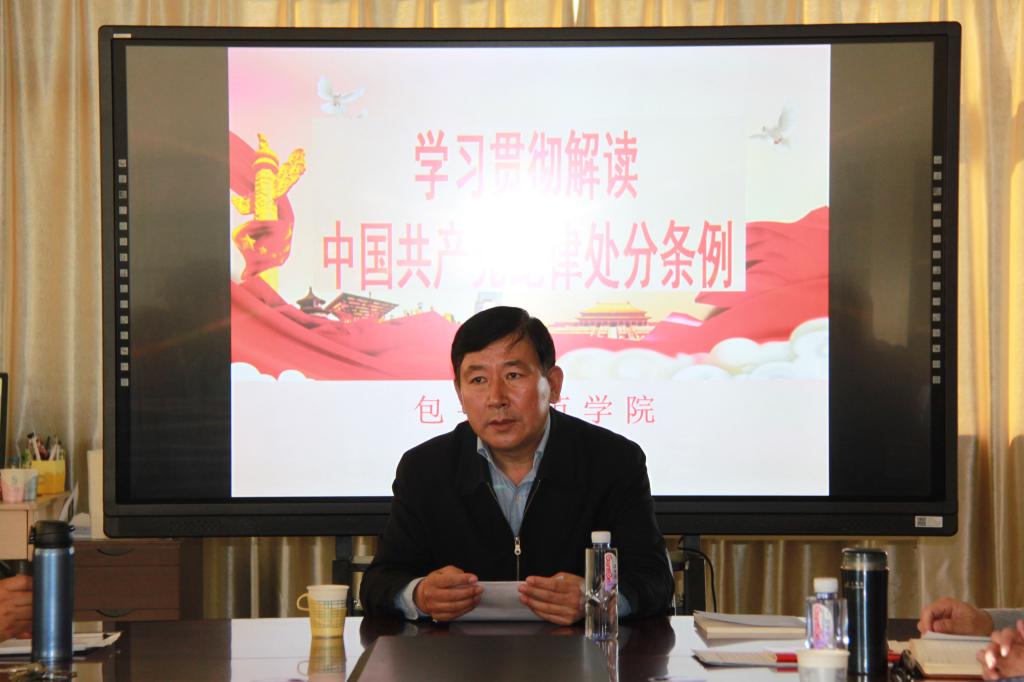 他要求,学院领导班子要继续保持优良的工作作风和工作干劲,要以永远在路上的恒心和韧劲,带头学习好、掌握好《条例》,切实抓好《条例》的贯彻执行,切实担负起全面从严治党政治责任,以身作则,以上率下,加强纪律教育,强化日常管理和监督,让广大党员同志进一步增强纪律意识、规矩意识,让制度“长牙”、纪律“带电”,充分发挥纪律建设标本兼治的利器作用,使铁的纪律真正转化为党员干部的日常习惯和自觉遵循,使党员干部习惯在受监督和约束的环境中工作生活。党员同志要认真学习,深刻领会,增强学习贯彻执行《条例》的自觉性、主动性;严格坚守党的政治纪律和政治规矩,以《条例》为高压红线,做到在工作生活中知敬畏,明底线,使铁的纪律真正转化为我们的日常习惯和自觉遵循,推动全面从严治党向纵深发展,助力学院各项事业的健康发展。