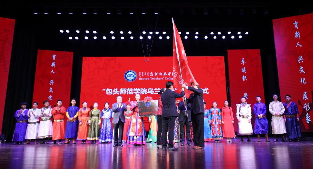 包头市委宣传部副部长石秀茹和学校党委委员、副院长施纪华向“包头师范学院乌兰牧骑”队长、音乐学院院长崔东伟授旗。