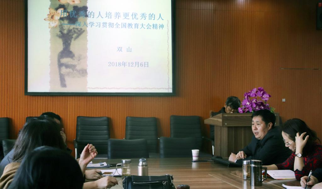 12月6日下午,校党委委员、副院长双山为文学院全体教职工作了题为“用优秀的人培养更优秀的人——深入学习贯彻全国教育大会精神”的形势与政策专题辅导。