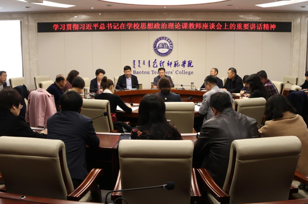 3月20日,包头师范学院召开座谈会,学习贯彻习近平总书记在学校思想政治理论课教师座谈会上的重要讲话精神。校领导王永明、刘兴旺、杨春生出席会议,党委宣传部部长史瑜主持会议。