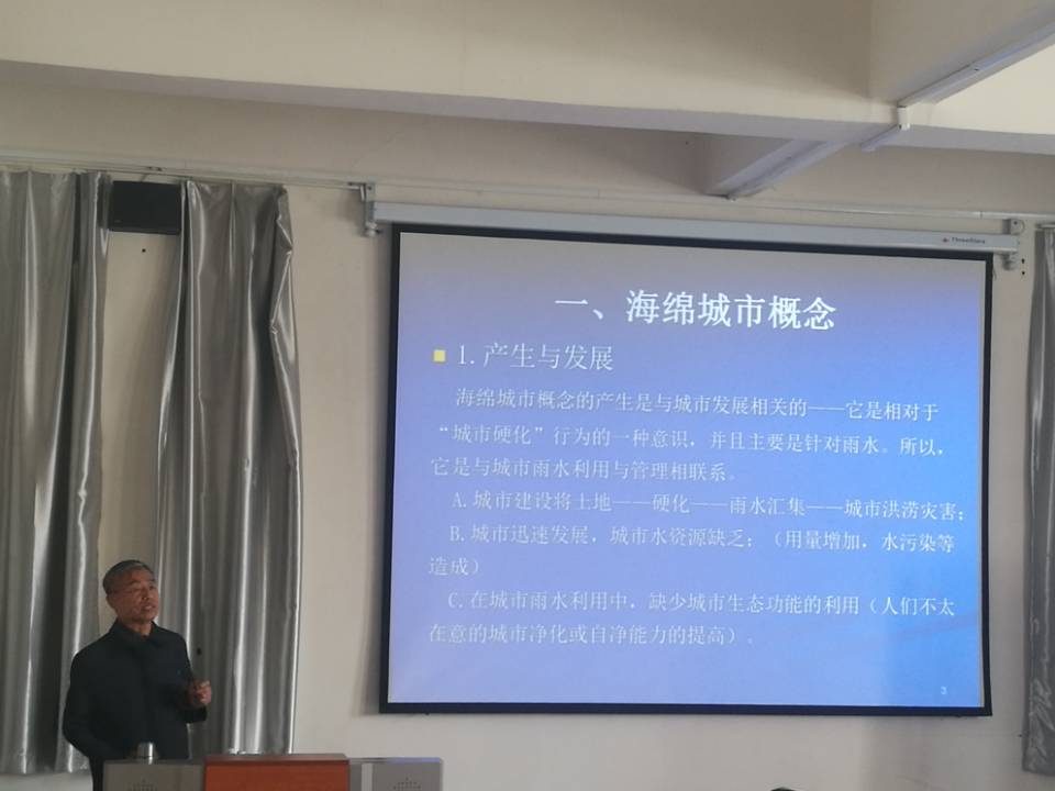 关卓今博士主要从海绵城市的概念;海绵城市建设的价值;海绵城市生态设计理论和方法;干旱区海绵城市建设的优势等四个方面给在场师生进行了深入、细致地讲解。重点介绍了海绵城市绿色积雨环境系统模式,他认为在建筑、道路等硬化地面和绿地、排水系统组成的海绵城市绿色环境系统中,采用“典型下凹式绿地”可以实现雨水资源的有效收集和利用。
