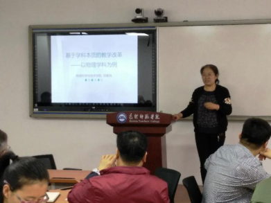 本次教学沙龙由物理学院副院长郭凯敏主持。郭院长对本次沙龙的分享人、北师大物理课程与教学论专业博士田春凤进行了介绍,田春凤博士结合自己的研究领域,以“以物理学为例基于学科本质的教学改革”为报告主题作了分享。