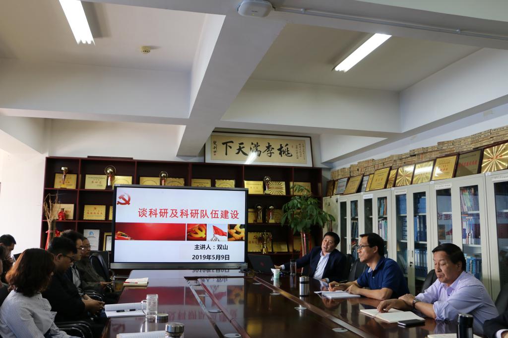 双山同志以《谈科研及科研队伍建设》为题从大学与科学研究、教学与科研的关系、二级学院如何抓科研工作和教师个人如何做科研工作等四个方面做了深入浅出的讲解。他结合当今高等教育发展趋势,深刻说明了抓科研对大学发展及大学核心竞争力的提升具有重要意义。他与教师们分享了二级学院如何抓科研工作和教师个人如何做科研工作的几个观点,并强调队伍建设是关键、要把好人才引进关,对教师管理要有“考核、奖惩、激励”等制度措施,提醒青年教师要认真对待教学工作,积极参加各种学术活动,充分利用时间进行阅读和学习。