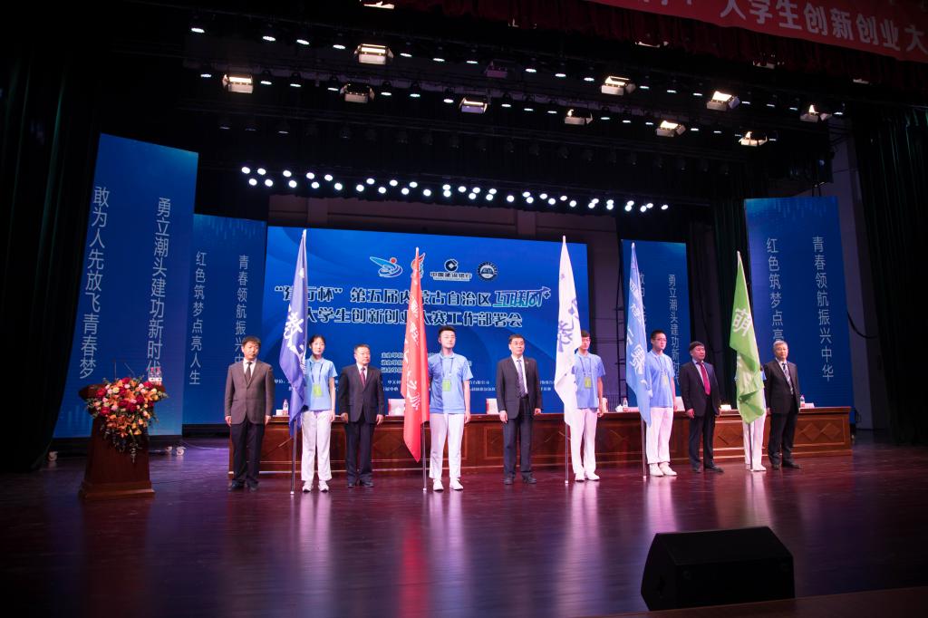 与会领导为“互联网+”创新创业大赛各赛道授旗。