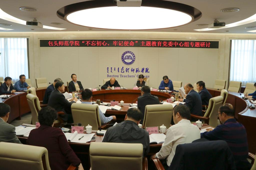 按照主题教育开展学习研讨的要求,校院两级中心组聚焦学习贯彻习近平总书记关于“不忘初心、牢记使命”的重要论述,围绕党的政治建设、全面从严治党、理想信念、宗旨性质、担当作为、政治纪律和政治规矩、党性修养、廉洁自律8个方面,列出专题,组织交流研讨。10月27日下午,党委中心组以“增强四个意识、坚定四个自信、做到两个维护”为题进行专题研讨。自治区主题教育第二巡回指导组副组长苗耀增、联络员卜艳峰、成员孟国珍、包双成参加并指导研讨活动。学校党委中心组成员、各二级学院党总支书记、各职能部门负责人参加了研讨。
