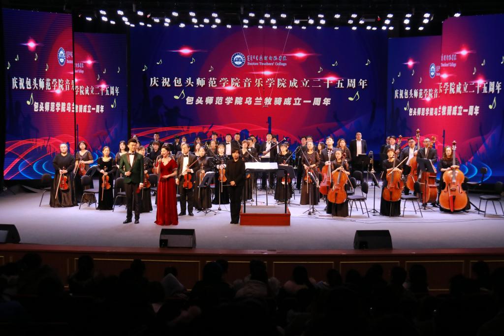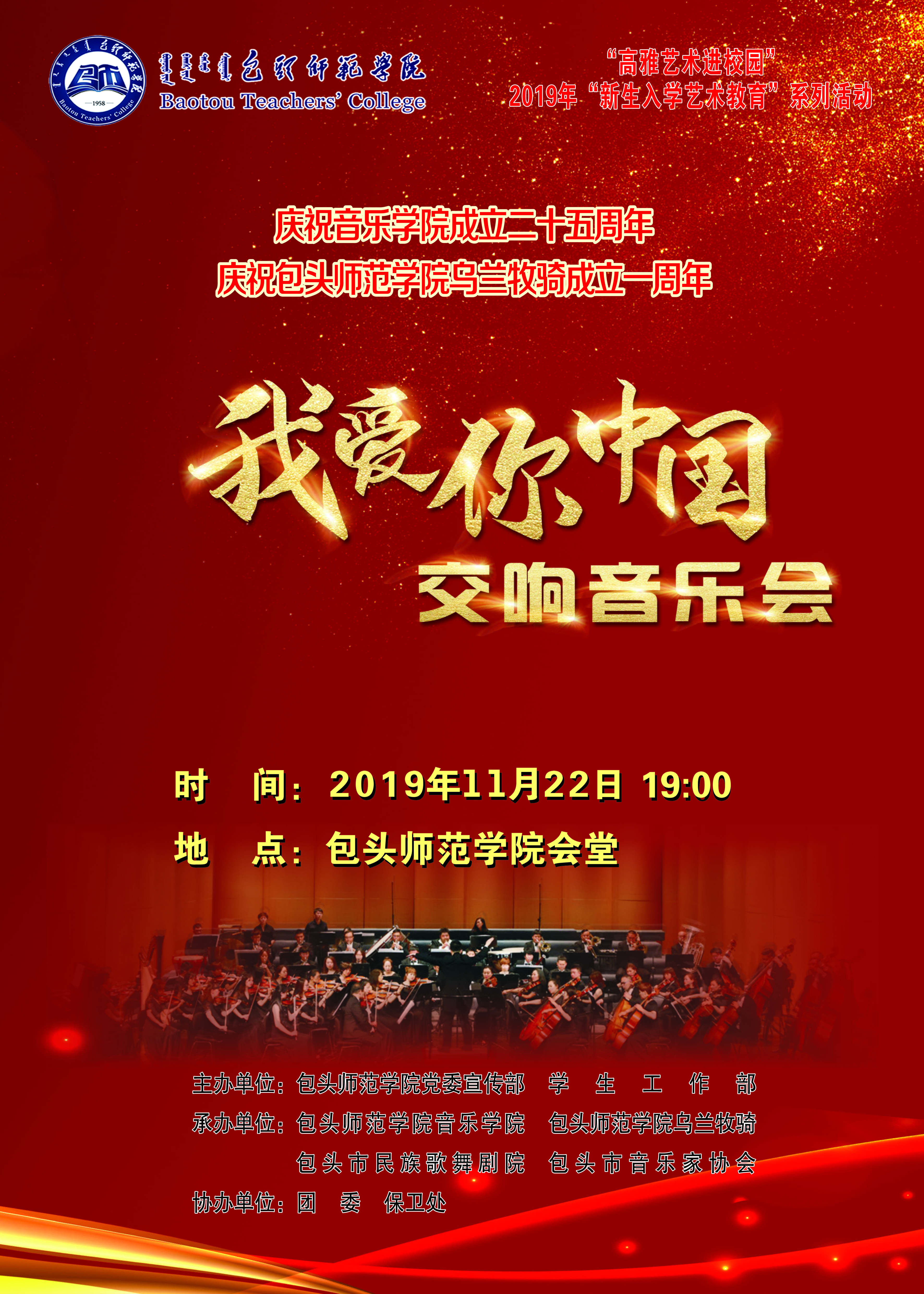 11月22日,包头师范学院“高雅艺术进校园”2019年“新生入学艺术教育”活动——庆祝音乐学院成立二十五周年、庆祝包头师范学院乌兰牧骑成立一周年《我爱你中国》交响音乐会在包头师范学院会堂奏响。各二级学院老师及新生代表800余人欣赏了本次音乐会。