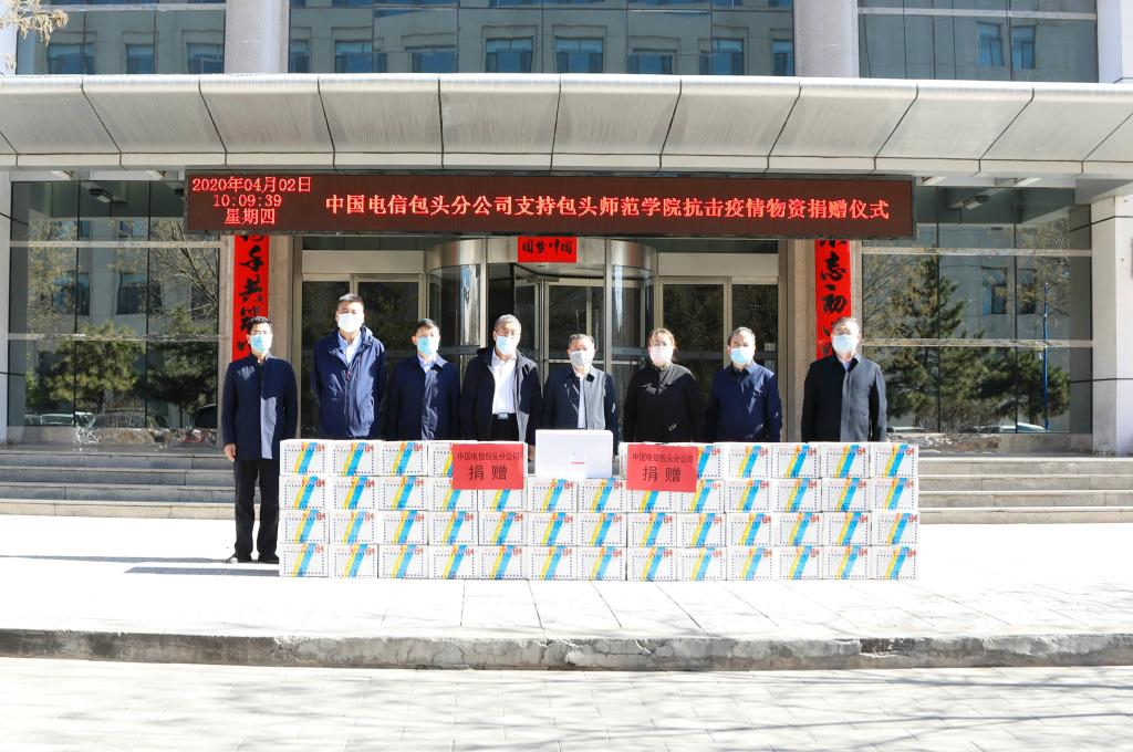 4月2日上午,中国电信包头分公司总经理潘生一行4人向我校捐赠了一批防疫物资,助力我校复工复学。学校党委书记王永明,党委委员、副院长施纪华,以及学校党政办公室、学生工作部、后勤处等相关部门负责人参加了此次捐赠仪式。