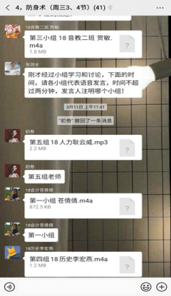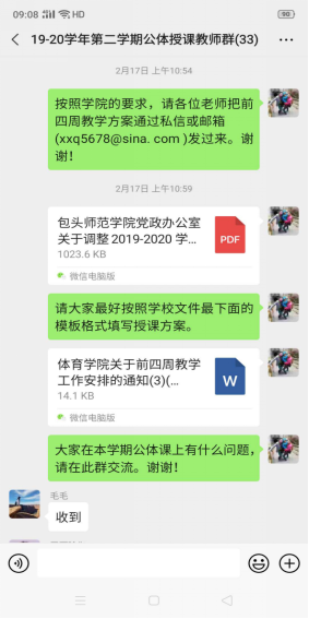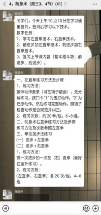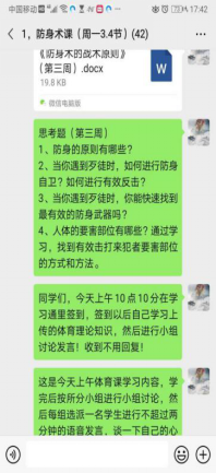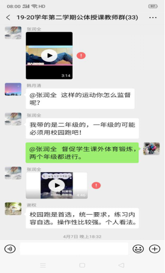体育学院十分重视体育课程的线上教学工作,为体育课程线上教学提供了大量的教学资源。由于公共体育课程涉及学生数量多班级多,学院还建立了33人的公共体育授课教师群,在群里探讨线上授课方案、交流教学经验、解决学生的各种问题。学院按照学校教务处的线上教学总体要求和具体的教学工作安排,制定了本学期公共体育课程在线教学组织实施方案。老师们明确并统一了线上教学的基本内容和目标。