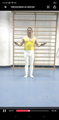 陈波老师进行的动作示范:跳绳、开合跳、仰卧起坐、俯卧撑、仰卧举腿、背肌训练、肋木举腿