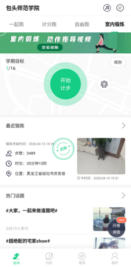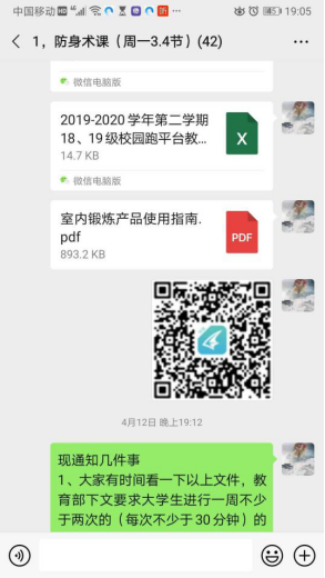 在指导学生课外体育锻炼中,按照教育部《关于新冠肺炎疫情期间进一步做好高等学校体育课程在线教学的指导意见》要求:“学生每周课外锻炼至少达到2-3次,每次锻炼30分钟以上,为返校后体质测试做好准备”。为此,体育学院结合大学体育课程,积极与校园跑平台取得联系,利用校园跑平台推出的室内锻炼功能对我校18、19级学生课外室内体育锻炼进行监督与指导。把从教务处获取的6700名学生的信息和33名授课教师及150个教学班的数据通过校园跑平台进行了录入,同时制定了我校2019-2020学年第二学期18、19级学生课外室内锻炼实施方案。