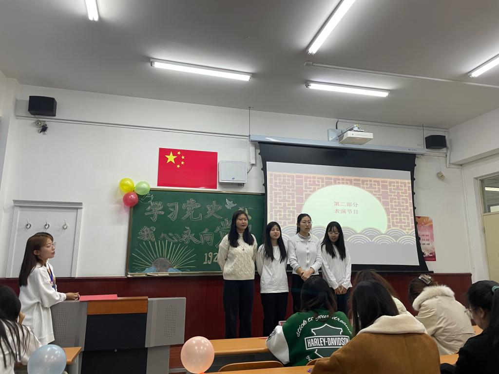 活动设有小组答题和才艺展示两个环节。首先,知识竞赛环节分为必答题环节和抢答题环节。题目围绕党的百年历程与光辉岁月展开,考察党史的重要阶段的大事记与重要会议内容、人物及意义,参赛选手们在答题中积极活跃,思维敏捷清晰,题目对答如流。竞赛提高了学生们对党史的理解程度,丰富了党史知识的储备。随后,参赛选手们以歌唱形式歌颂党和伟大祖国,如《唱支山歌给党听》《我和我的祖国》《强军战歌》《打靶归来》等。同学们的精彩表现展示出了当代大学生的青春风采与激情活力,也表达了同学们对党和祖国的热爱之情。