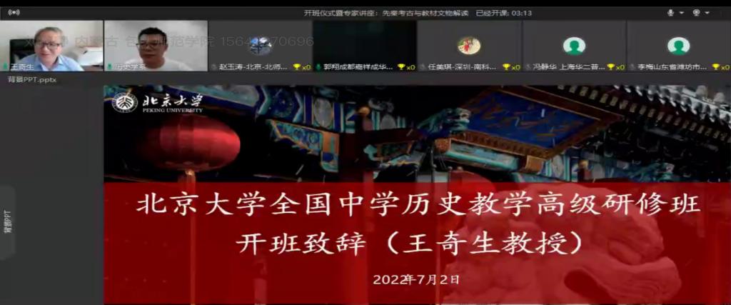 2022年7月2日下午,北京大学历史学系主任王奇生在开班仪式上致辞。介绍了北京大学历史学系的基本情况和在教育教学方面取得的成绩。王教授强调北大历史研修班一定是保质保量的,并为历史教育工作者建立学习交流平台,搭建沟通的桥梁,并希望学员们经常作学术交流切磋及到北大来参观访学。在一个月的时间里,北大教授和历史教育专家们带来了精彩纷呈的讲座,从不同的角度为历史教育者传道授业解惑,使学员们了解最新的学术动态,明确今后教学及研究的方向。