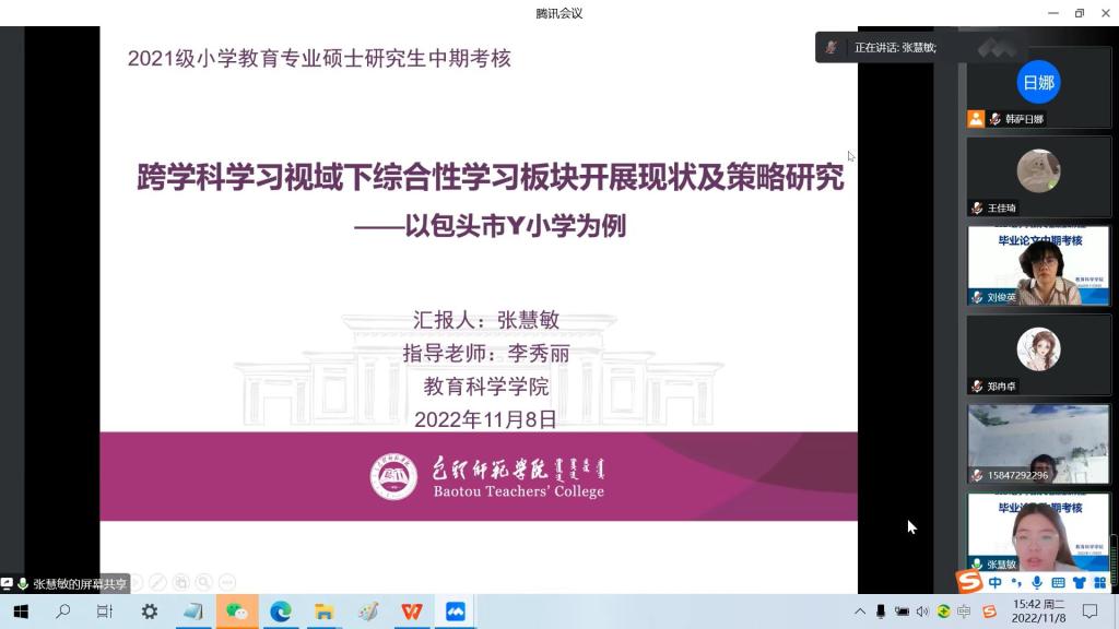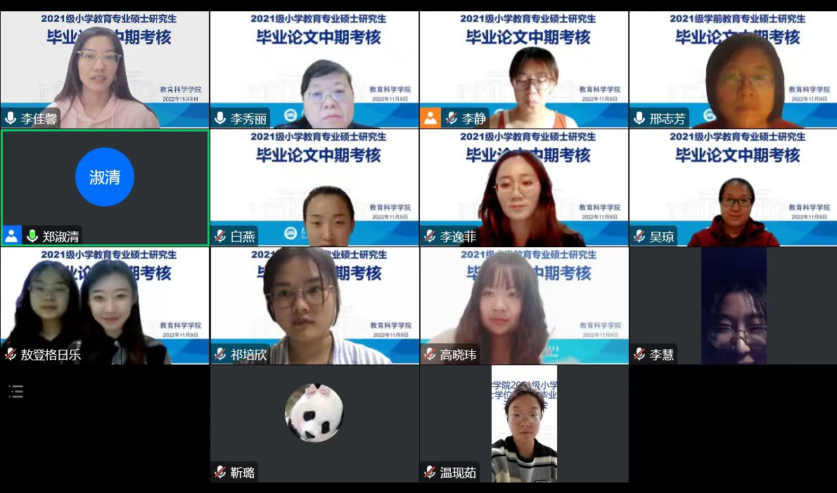 中期考核是教学质量监控的重要手段,是检验研究生培养质量的重要环节。2022年11月8—9日下午,教育科学学院在线上举行了2021级全日制教育硕士学位论文中期考核工作会,中期考核共邀请7位评审专家和3位答辩秘书组成中期考核委员会,由李芳院长担任组长,共有27名研究生参与中期考核。