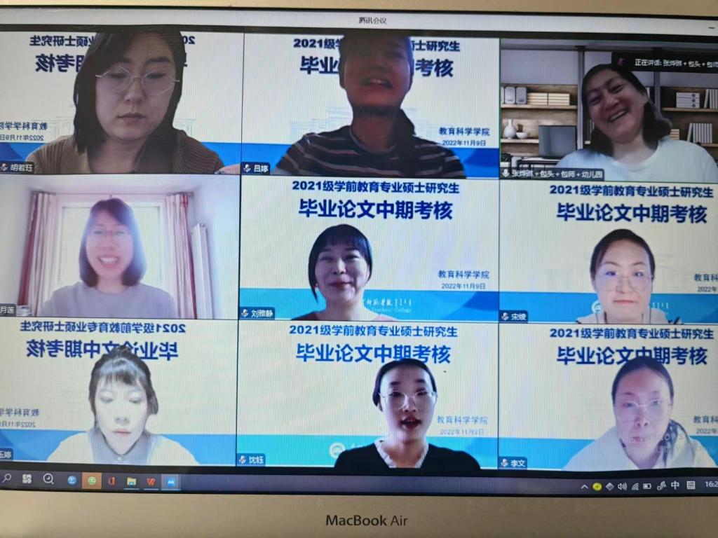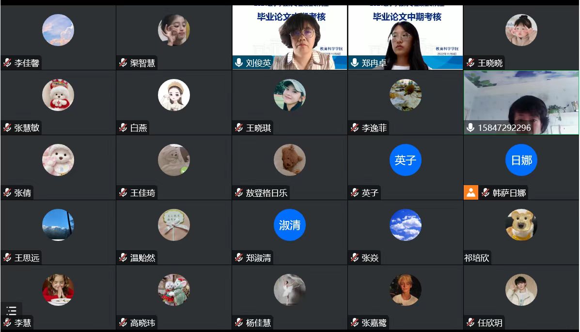 本次考核严格按照教育科学学院中期考核方案进行。参加考核的研究生在规定时间内对本人的思想政治表现、科研成果、毕业论文进展、下一步研究计划等方面进行详细汇报。考核过程中,考核小组委员刘俊英、王敏、李秀丽、邢志芳、王月莲和张烨琳老师从理论基础、研究思路和研究的创新性等方面对同学们汇报的内容进行现场提问,对存在的不足提出改进意见。
