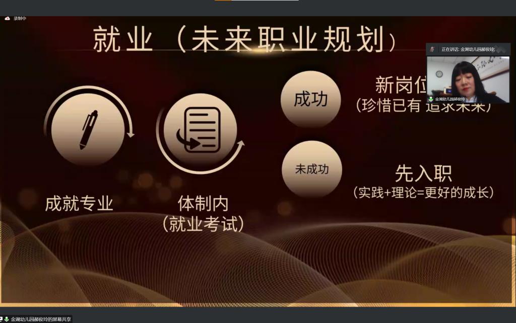 其次,金湖幼儿园郝俊玲园长从“人生的第一桶金从哪里来”这一话题与同学们展开讨论,指出了同学们就业的两条道路:一是考研,郝园长与同学们分享了助力考研成功的秘密武器;二是就业,郝园长指导大家首先要了解自己的专业,了解社会的需求及要求;其次要下定决心,做好规划,边学习边实践;最后要投入时间与精力,保持自律,严格要求自己。郝园长鼓励同学们提高个人核心竞争力,踏实笃行,争取成为优秀的教师。郝园长留下个人联系方式,欢迎同学们来金湖幼儿园应聘。