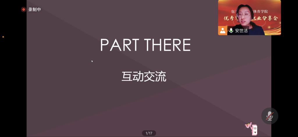 12月18日,体育学院举行了线上优秀毕业生就业分享会,全体19级学生及部分20级学生参会。分享会由学工办负责人安世洁主持。