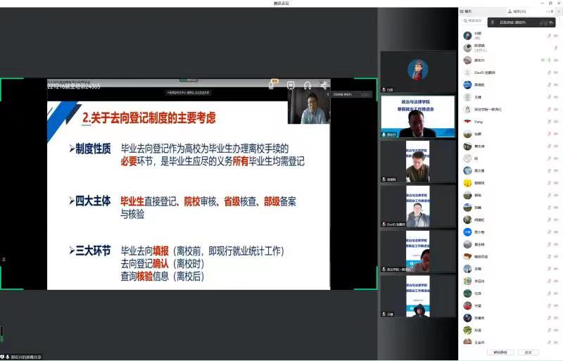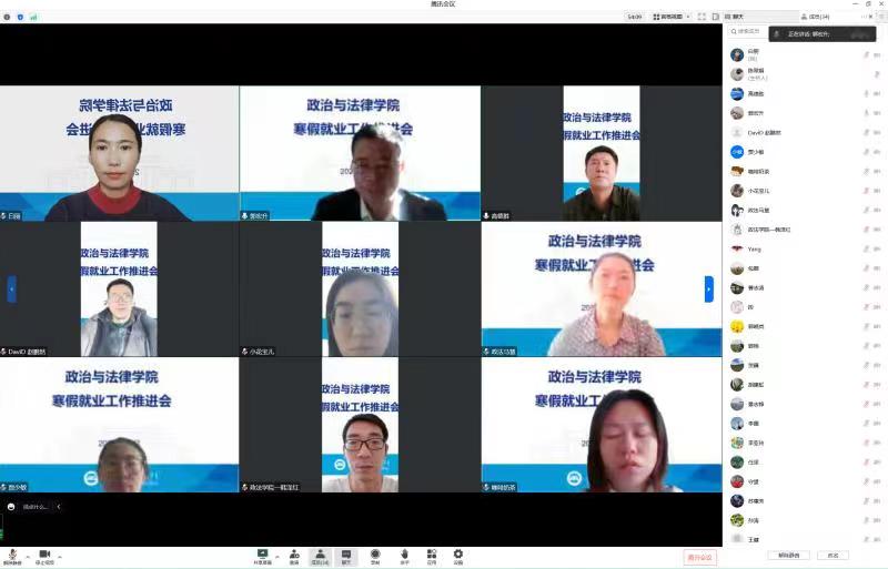 为深入贯彻教育厅关于做好高校毕业生就业工作的重要部署和学校关于落实寒假就业服务不断线的工作要求,2022年12月30日,政法学院在腾讯会议上召开了寒假就业工作推进会。学院党总支书记高德胜、副院长李霞、副书记郭宏升和全体教师参加了会议。