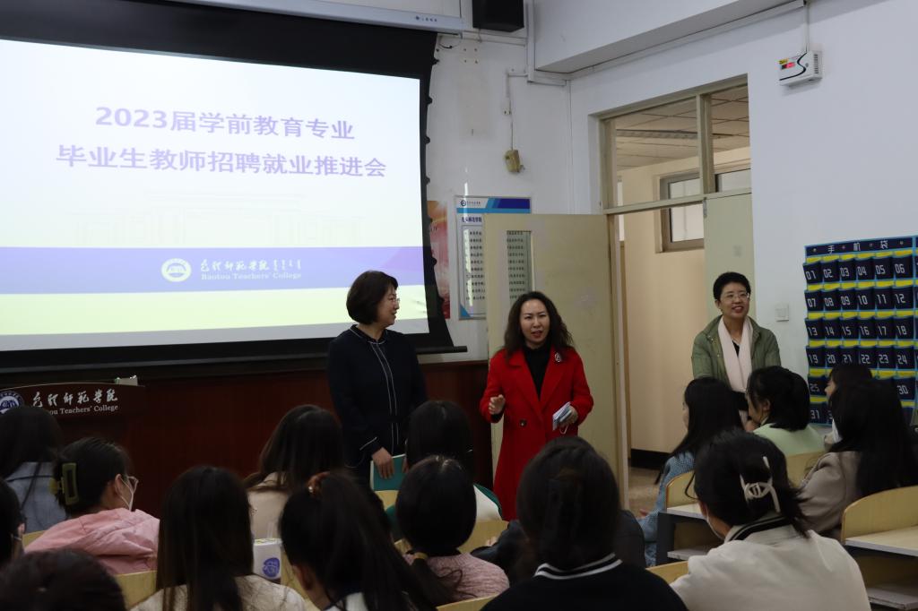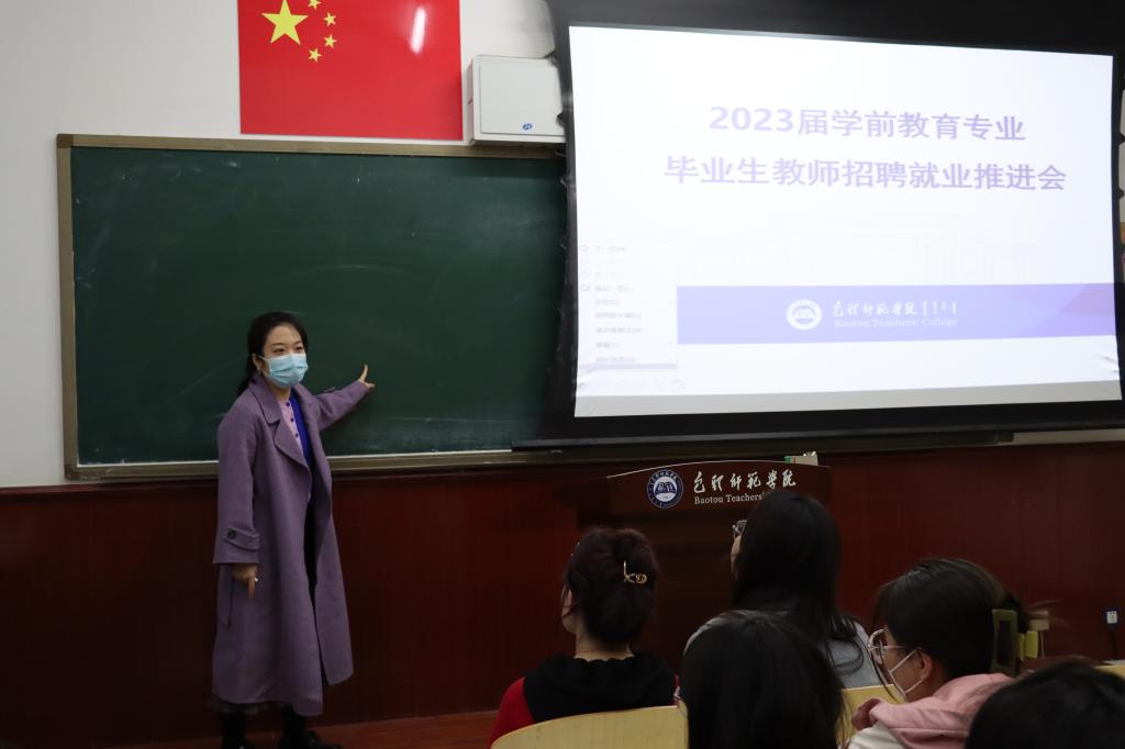 2023年3月昆都仑区面向包头师范学院定向招聘幼儿教师公告发布后,为解答教师和应往届毕业生的相关问题,教育科学学院于2023年3月2日召开了2023届学前教育专业毕业生教师招聘就业推进会。招生就业处处长吕煜瑜、教育科学学院院长李芳、党总支副书记李燕、辅导员、全体毕业班班主任和2023届全体学前教育专业毕业生参加了此次会议。