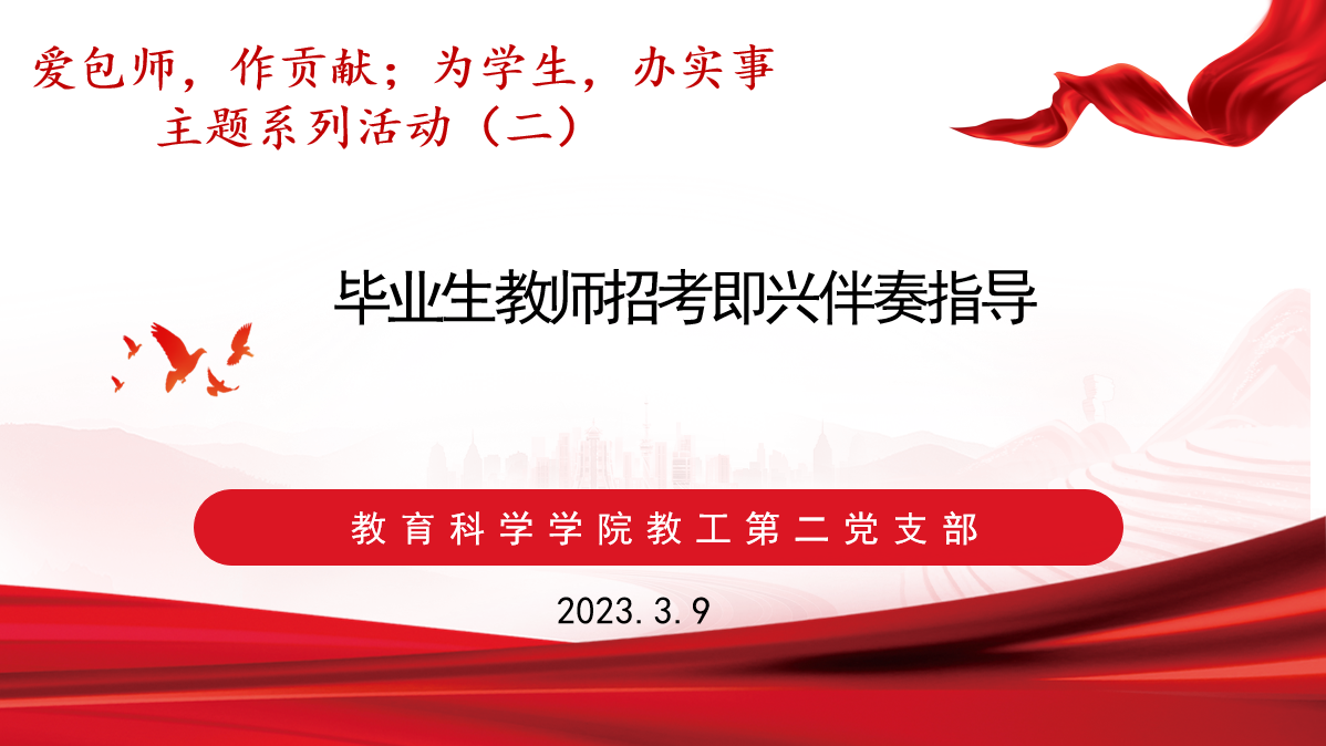 为深入学习习近平新时代中国特色社会主义思想和党的二十大精神,努力践行“爱包头,作贡献”主题实践活动,在九原区、昆区教师招考到来之际,为提升学生的教师招考面试能力,提高应届毕业生弹唱技巧和即兴伴奏技能,增强面试信心,3月9日下午,教育科学学院教工二支部石翠花老师开展了即兴伴奏教育指导活动,共有20名备考学生参加了本次辅导。