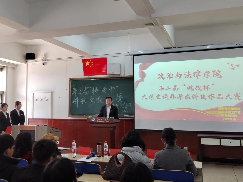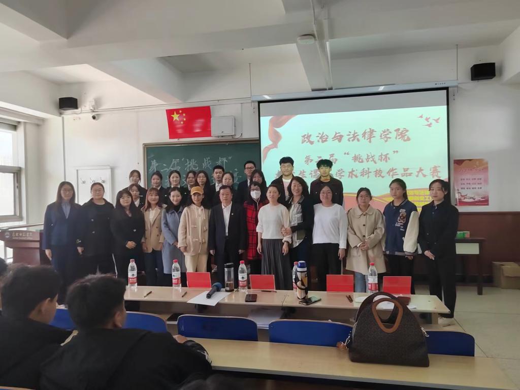为贯彻落实党的二十大精神,深入实施科教兴国战略、人才强国战略、创新驱动发展战略,培养及提高学生的创新精神和实践能力,促进高校学生课外学术科技活动的蓬勃开展,3月18日上午,政治与法律学院在博学楼600教室举办了第二届“挑战杯”大学生课外学术科技作品大赛。学院党总支副书记郭宏升、团总支书记袁爱荣老师、政治学与行政学系主任马慧、社工系博士任泽、辅导员白丽担任本次大赛的评委。来自四个年级的12支代表队参加了本次比赛,大一大二派学生代表观看了比赛。