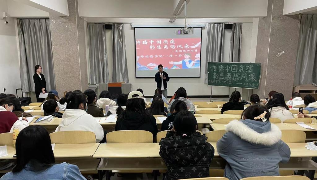 为深入推进文化自信自强,增强中华文明传播力和影响力,提高学生英语应用能力,外国语学院于3月26日在新逸夫楼124教室举办了“传播中国底蕴,彰显英语风采”英语演讲比赛,学生包涵、韩静静、候欣宇担任评委。