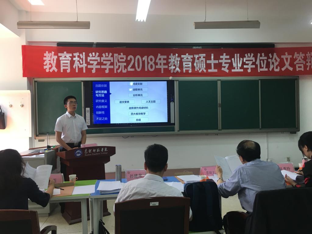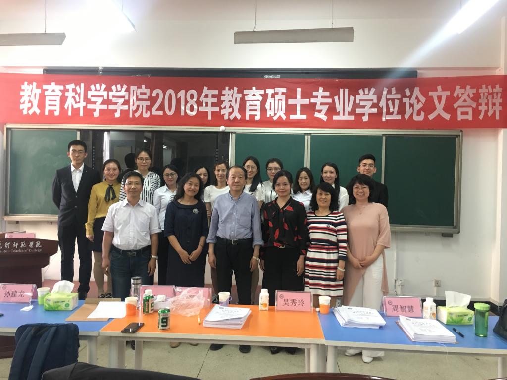 5月25日,教育科学学院举行了2018届教育硕士研究生专业学位论文答辩会。本次答辩委员会主席由首都师范大学初等教育学院副院长郜舒竹教授担任,答辩委员为首都师范大学初等教育学院孙建龙副院长、包头市教育督导评估中心吴秀玲主任、教育科学学院院长郝红英教授以及包头师范学院科技处副处长周智慧教授。教育科学学院副院长李芳教授负责答辩工作的组织与协调,王婵娟老师担任答辩委员会秘书。我院2018届教育硕士专业学位硕士研究生祁欢、景桥、高学玲、于洪健、马凤洁、白璐、陈琛、石晓委、李春凤、李树奇、李佳丽十一名同学依次进行了答辩,2017级全体在读教育硕士专业学位研究生聆听了答辩会。