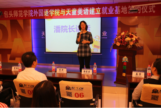 签约仪式上,潘若芸首先代表外国语学院介绍了历届毕业生在就业中面对的困境和建立就业基地的初衷。李泽校长代表天童美语介绍了学校的基本情况和拟为大学生提供的就业实践内容。之后,外国语学院2015届毕业生、特级讲师高鑫详细讲述了她在天童美语的成长之路。最后,潘院长为天童美语授牌,正式签订该校为就业基地。